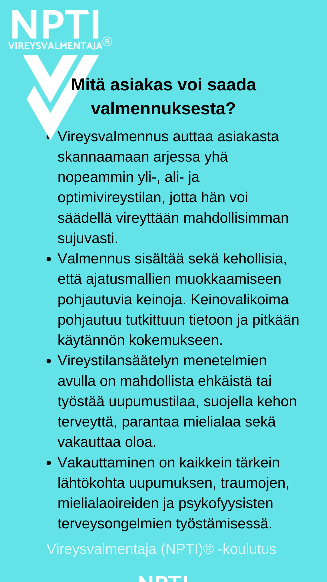 Tiedenäyttöön perustuva, trauma- ja nepsyinformoitu vireystilan säätelyn prosessi, joka pohjautuu Vireysvalmentaja (NPTI)® -koulutukseen.